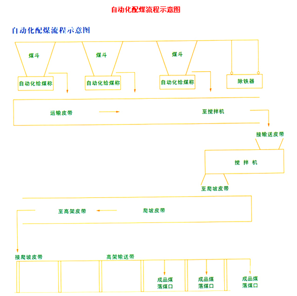 自動(dòng)配煤流程通常選用2-8種煤經(jīng)進(jìn)料倉(cāng)——輸送帶——篩分破碎系統(tǒng)(可選)——特制攪拌機(jī)——成品煤輸送皮帶(高架皮帶輸送機(jī))——成品煤