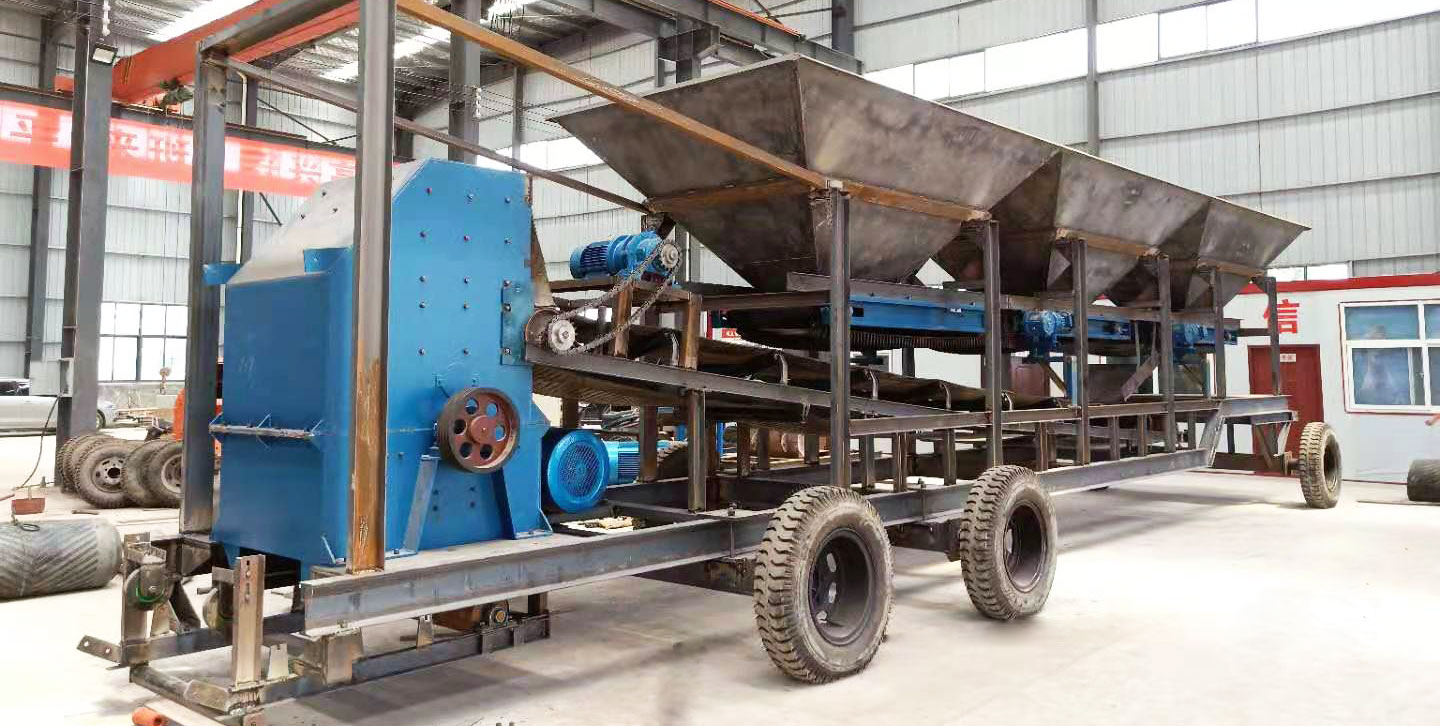 用裝載機將待破碎的物料裝入料斗,通過輸送帶的傳動,將物料送到破碎機,在掛有錘頭的轉(zhuǎn)子盤在電動機的驅(qū)動下,帶動錘頭做高速圓周運動,當(dāng)物料進(jìn)入破碎腔后,受到高速旋轉(zhuǎn)錘頭的打擊,物料高速射向反擊板后的撞擊、高速飛射物料間的摩擦撞擊而破碎,符合粒度要求的物料由規(guī)定篩孔中卸出。經(jīng)一次破碎粒度不符合要求的物料,隨著新進(jìn)物料被錘頭再次沖擊破碎。